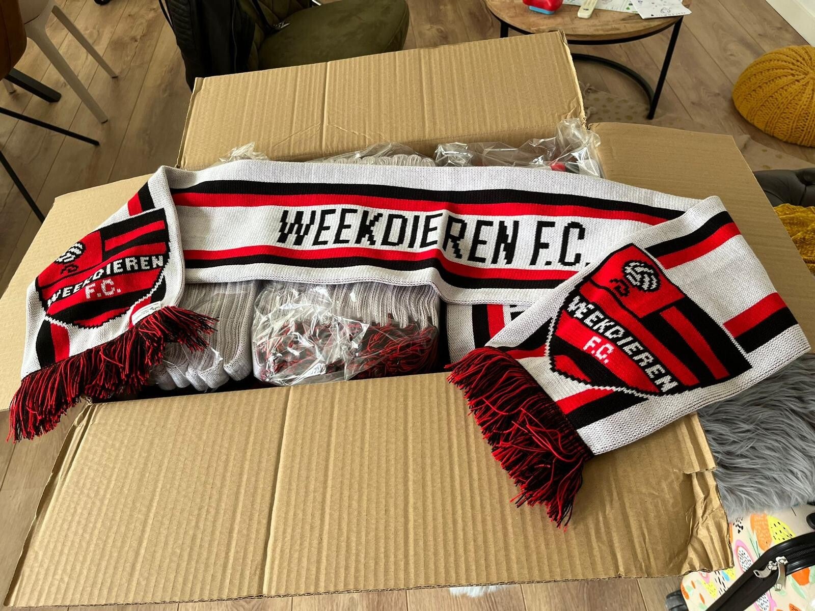 Bestel nu de officiële Weekdieren F.C. sjaal. Perfect voor het aamoedigen van de Weekdieren en om heerlijk warm te blijven. Deze sjaal dringt zich niet op. Hij is er gewoon. Als een goede vriend die je jas nét completer maakt en je dag nét aangenamer. Omslaan, diep ademhalen, klaar. Sommige dingen voel je meteen goed zitten.