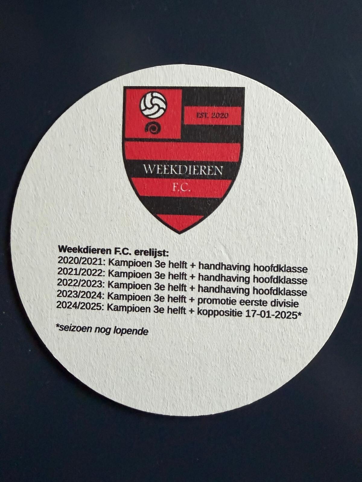 Bestel nu de officiële Weekdieren F.C. Bierviltjes. Dit item is superleuk voor thuis en op feestjes. Ook is het altijd een blijvende herrinering aan de wonderlijke eerste seizoenshelft van 2024/25.